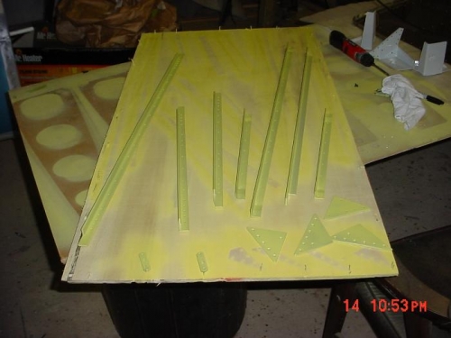 PRIMED ANGLES FOR FIREWALL. STARTED RIVETING RIGHT INBOARD WING SKIN.