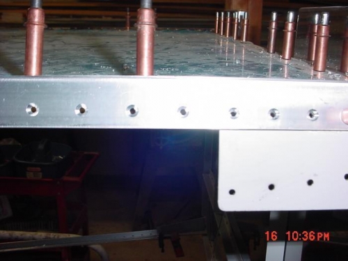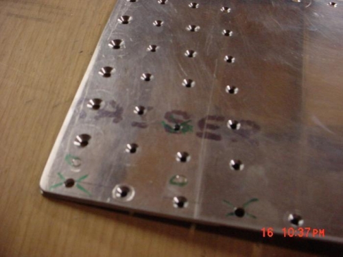 FITTED AND DRILLED LEFT FORWARD GUSSETT F855 . DEBURRED LEFT FORWARD SKIN F820 AND COUNTERSUNK AUX LONGERON AND LOWER LONGERON. ALSO COUNTERSUNK SPACER PLATE FOR LEFT SIDE.