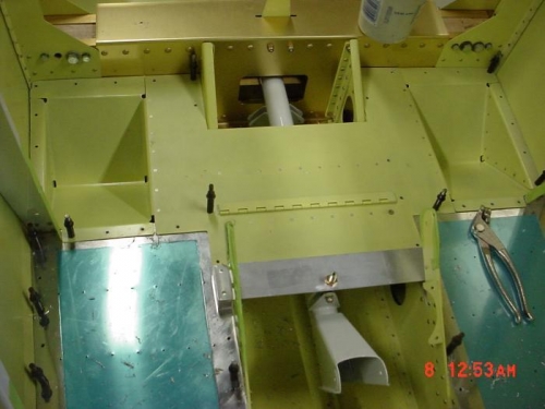 RIVETED BOTH F805 FLOOR ANGLES TO SIDE BULKHEADS AND TO FLOOR RIBS. BACKRIVETED FOOTWELLS TOGETHER AND RIVETED TO F829 FORWARD FLOOR.