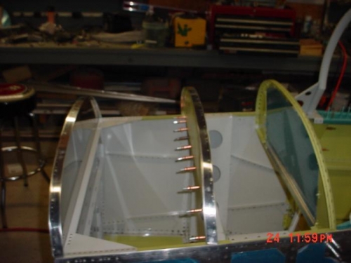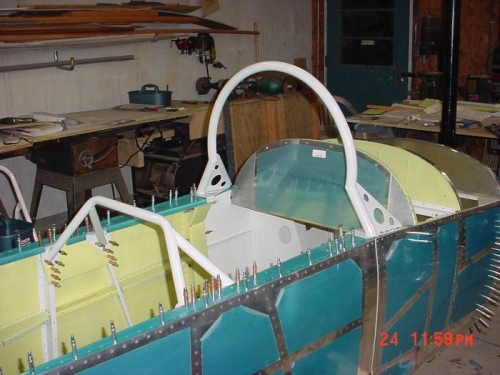 FINISHED DRILLING SEATBACK WELDMENT. FABRICATED ANGLE FOR FRONT OF COCKPITRAIL. FIT AND DRILLED WINDSCREEN ROLLBAR TO F887 LONGERONS. HAD TO STRETCH ROLLBAR WELDMENT 3/4 INCH. DONE WITH A ENGINE LIFT. DRILLED BAGGAGE DOOR STRIPS