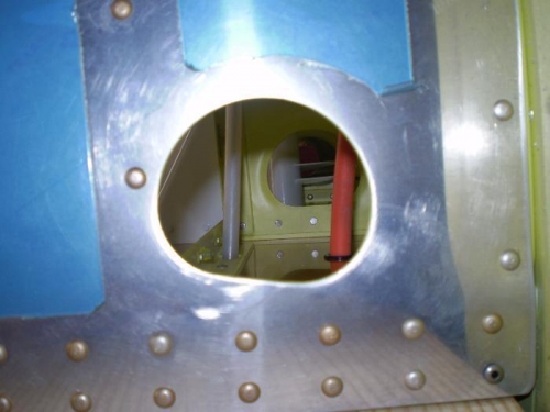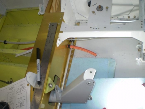 DRILLED HOLES IN BULKHEADS AND SPAR TO ROUTE BATTERY CABLE FROM AFT OF COCKPIT. SECOND PICTURE SHOWS CABLE AT LOWEST POSSIBLE.STILL MIGHT BE INTERFERENCE WITH AILERON PUSH ROD.
