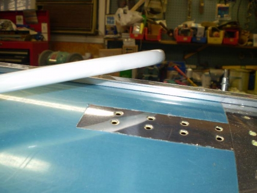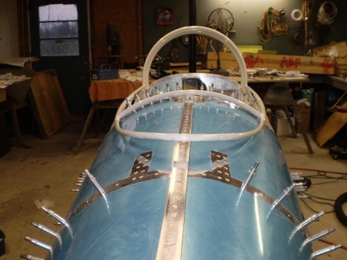 FITTED CANOPY FRAME TO SLIDER CAP AND SIDE RAILS. DRILLED SIDE CANOPY RAILS TO FUSELAGE. BENT REAR OF CANOPY FRAME DOWN TO 5/8 IN REAR AND FITTED TO FUSELAGE SIDES.