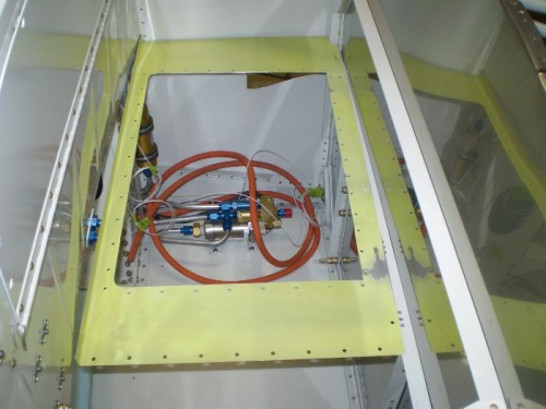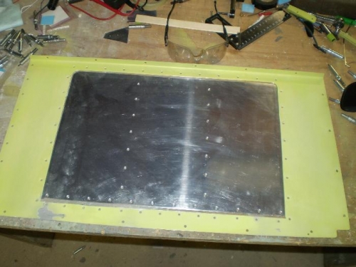 CUT HOLE IN FORWARD BAGGAGE FLOOR. FABRICATED STIFFNERS AND HINGE TO MOUNT ACCESS DOOR FOR ACCESS TO RUDER PEDALS AND FUEL FILTER.