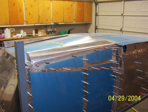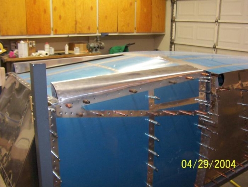 Section 8 Fuselage Date 4/29/2004 The center and forward side skins are fitted, drilled and clecoed next. Fitting and drilling is very straight forward, trimming to fit the longerons was easy enough. Riveting with my son as my helper was an enjoyable experience. (Image) 190,191&192