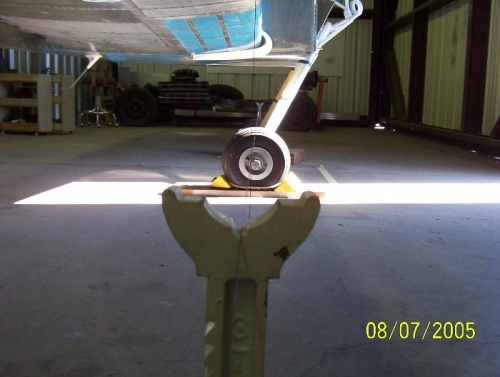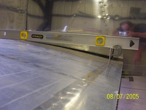 I drilled the rear spar and set the sweep and incidence. I used some unique fixtures to set up and check the alignment of the wings. Instead of a chalk line on the floor I used a string suspended off the floor with jack stands.Plumb bobs hanging from the leading edge of the wing. Measuring from wing tip to centerline of the fuselage at the firewall and tail. Being able to make small adjustments of the string after moving the wings to location was desirable. Measuring to a plumb bob string and a datum string made the rigging accurate.Darn it I have to drill out the piano hinge on the flap to get the location I need to the fuselage.