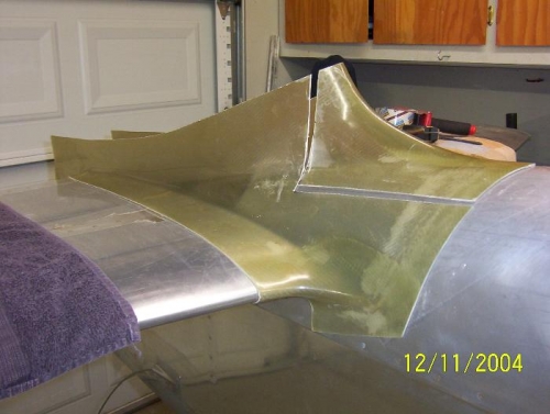 Section 8 Empennage Fairing Date 12/11/04 I started with the empennage fairing supplied with the kit. It seems to be close to fitting my aircraft. The more I worked with it the more frustrated I became with the whole process. After several hours I found the best way to work with this fairing. I cut it in half and thru it a way! I purchased a new fairing from Fairings Etc. The initial fitting was much closer the first fairing. (Image) 100-080 100-083 & 100-085