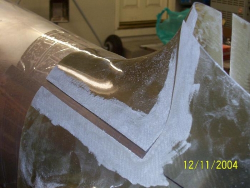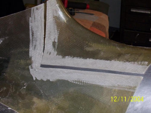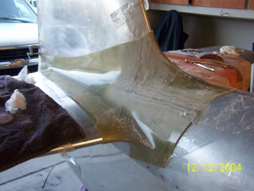 Section 8 Empennage Fairing Date 12/11/04 I cut the new fairing into two parts and faired the edges in preparation for fiberglass and resin. After I installed the vertical stab. I adjusted the fairing to fit ,drill and cleco in place. I laid fiberglass and polyester resin into the prepared area. After all of this was done I sent the fairing off to Bob at Fairings Etc. Bob performed the final fairing of the re-glassed area. (Image) 100-086 100-087 & 100-093