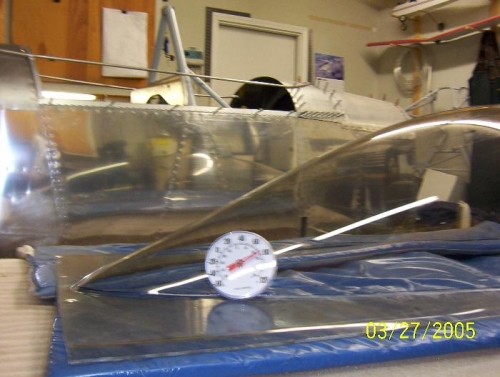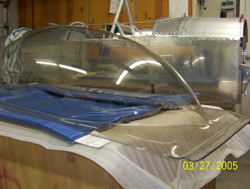 Section 9 Installing the Canopy Date 3/31/05 I started to cut the canopy today. I heated the shop to 80 degs. before cutting the canopy. I used a air drill with the fiber disk supplied in the kit . This combination worked very well. After marking the canopy with a sharpie pen from the inside I proceeded to trim the canopy " at a time. After two of sessions I had the fit to the frame. (Image) 100-0157 100-0158 & 100-0159