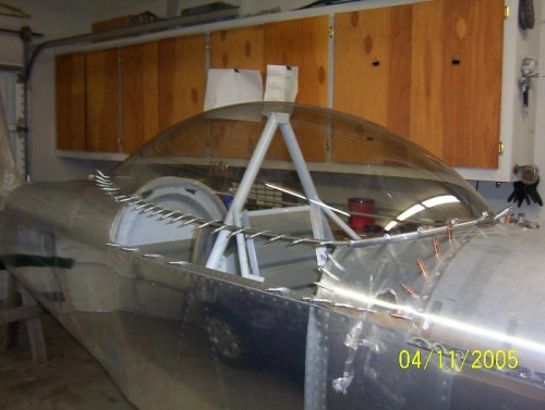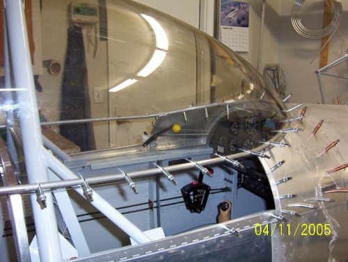 Section 9 Installing the Canopy Date 4/11/05 The next procedure is to drill thru the canopy into the canopy frame. I accomplish this task with a #40 drill and clecos. I started by clamping the canopy to the frame all the way around the base. The canopy will maintain position to the frame as I drill a hole and replace the clamp with an cleco. After the #40 holes were drilled I removed the canopy and using a unibit I resize the holes in the canopy to 3/16". The holes in the frame were resized to #30 drill for the pop rivet. (Image) 100-0163 100-0164 & 100-0165