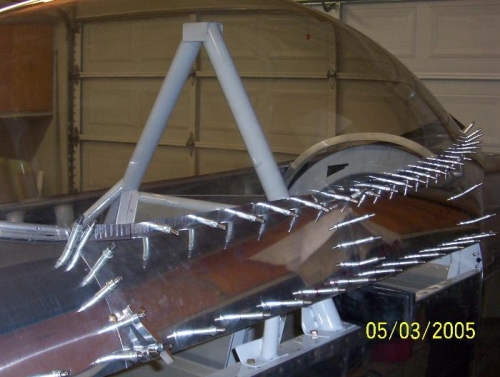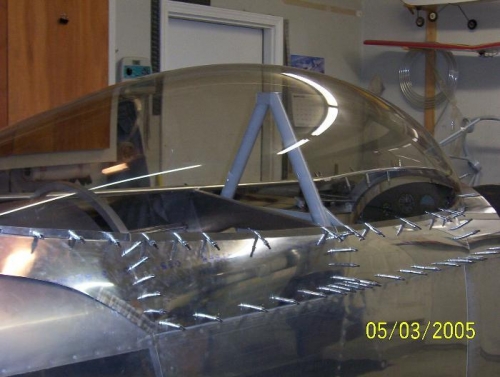 Section 9 Installing the Canopy Date 5/3/05 Fitting the canopy skins is the next step. After strapping a skin I change my process. Here's the method I used to do my canopy skirts. First get all the holes drilled through the canopy and frame. Take the canopy off and stash it out of the way for a while. Drill all of the holes through the bottom of the side skirt to the canopy frame. On the hinge side, I used a few flush rivets to hold the hinge to the frame temporarily. You'll probably need to trim the bottom edge of the side skirt to match the cockpit rails, but try not to give up too much material since it might be needed at the top. I next drilled and clecoed the skirt to the cross piece. I found that the shape of the flange left something to be desired, so I cut off the top couple of inches and will graft on some angle once everything else is done. Once this is clecoed in place, I took about a dozen little spring clamps and clamped the upper skirt to the canopy frame. Don't worry about the area aft of the rear seat. Next, take a pencil and wittle the first half inch or so flat on one side. This flat side will ride on the underside of the canopy frame while the tip marks the inside of the canopy skirt. I wittled the pencil until the first half inch was showing lead on the wittled side. This way the thickness of the pencil doesn't screw up the location of my line. I tried very hard to keep the pencil perpendicular to the skin as I went so that the line would stay where I intended. I only marked to the rear of the back seat bulkhead. I then removed the skirt and made a new line with a sharpie a half inch above this one. This line is the cut line. I cut along this line and then took my time getting it real fair and smooth. This line needs to be nice because the bending tool is going to ride along it. After it was all deburred and polished, I clamped it to a table and used the Avery canopy skin tool to gradually bend the edge. You'll want to practice on some scrap first and be aware that the tool will try to ri