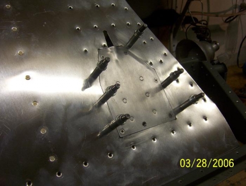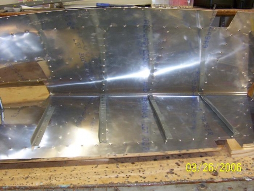 Section 6 Re-Building left elevator Date 3/28/06After drilling holes I used a C frame with a #40 dimple die set to dimple all the holes . Next I trimmed the skin to the scribe line. The new skin is alcad so I opted to not primer the in side and I started to install the stiffeners on the bottom skin. The servo skin needed to be fit to the new opening in the bottom skin. (Image) 00-0344,00-345 &00-346