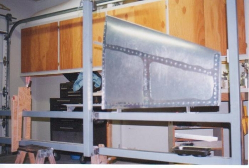 Chapter 6 Empennage Date 1/15/00 I started with the jig. for the empennage and wings. The builder manual has a detail drawing of a fixture for building the empennage and wings .The construction material is wood and in Nevada I am confident that it would shrink and distort. I made my building jig. from 2" square steel tube. Photo of fixture with vertical fin (Image) 014