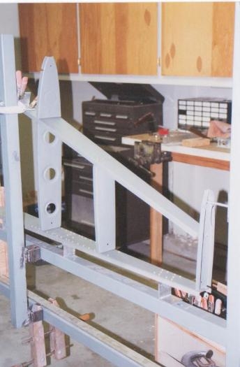 Chapter 6 Empennage Date 2/15/00 Procedure VS-2 Assembling the Vertical frame was very easy. I used fluting pliers to straighten the flanges of the vertical ribs. I located the ribs on the spars, drilled and clecoed them together. Then disassemble de-burr and prime. Reassemble and rivet all the parts together. (Image) 06