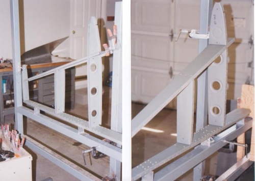 Chapter 6 Empennage Date 2/15/00 Procedure VS-2 Mounting the vertical frame to the jig. I decided to make mounting brackets from aluminum angle and instead of drilling the brackets all at one time. I drilled one bracket, clamped it in location and then ran a string thru the bracket to the other end of the jig. I leveled the string and used it to mark the other brackets at there locations. Since I made the fixture from steel and the brackets from aluminum I super glue them in location. It works great! Then mounting the frame was as easy as bolting it on. (Image) 013