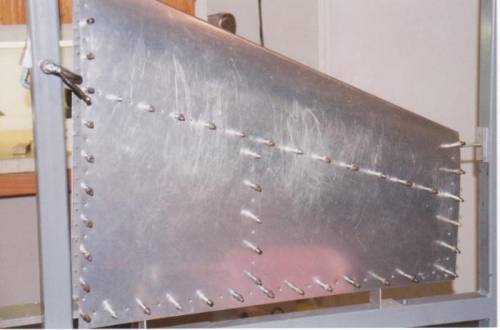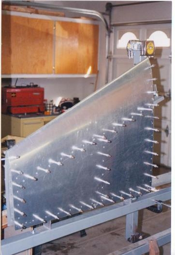 Chapter 6 Empennage Date 1/15/00 Procedure VS-4 Skinning the vertical stabilizer. Finding the ribs thru the skin is the same technique as the horizontal stabilizer. After drilling one hole at the intersection of the forward spar and the rib the remaining hole are easy to locate. I used a rivet fan to equally space the holes on the rib. After all this work I disassemble the skins from the frame, de-burr and dimpled the skins and frame. I primed the inside of the skins and reassemble with clecos. I checked the alignment of the frame and skins. Now it time to rivet the skins on .I used the skin clamps from the builder manual they worked great to hold the skins on so I could place the clecos before riveting the skins. I used a bucking bar and rivet gun for the middle part of the stabilizer and an squeezer for the outside edge. (Image) 07,08&014