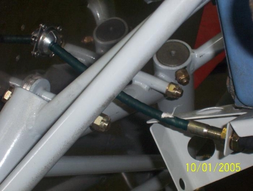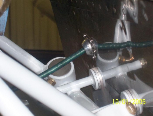 Section 11 Installing engine Date 10/1/05 Today I started the engine installation. I had to turn my airframe around in the hanger and move something's around. I browed an engine hoist and 30 minutes later a had the case bolted on.( the cylinder are out for overhaul) to the engine mount. The first thing to work on was the throttle cable. I used the ball type penetration thru the firewall. I drilled the aluminum ball section to accommodate the cable diameter. (Image)100-0396,100-397 &100-398
