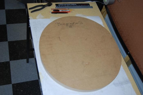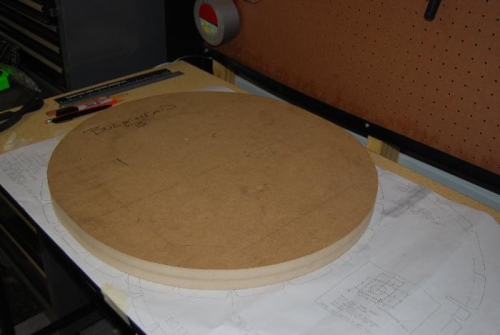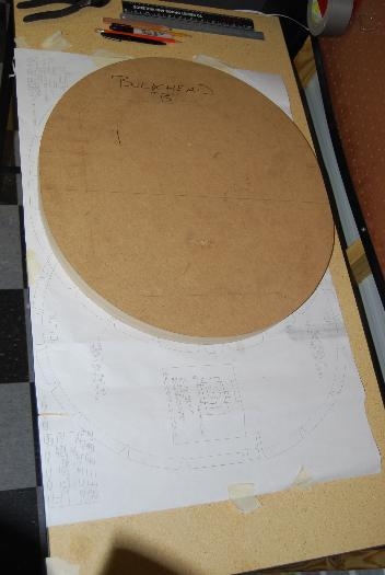This was my second attempt to create a form block, using the remains of the previously failed Bulkhead C form block. Using graphite-colored tracing paper and the full-size diagram for Bulkhead B on Sheet #4 of the UltraCruiser Plans, I copied the form onto the block of .75 inch MDF. Once the trace was made, I cut the block down within 5mm of the line. I made several passes with a bandsaw, carefully cutting away each time. Once I was within the 5mm space, I sanded the remaining MDF down to the line using a power belt sander. After completing the sanding, I measured the center and the placed the blocks on the plans diagram to match it up. It appears to be within .5mm of the diagram size. Note: I have not yet cut the center of the form block out yet as I will continue to cut other bulkheads before attempting an internal cut. Possible tools to complete this include using a router, a drill with a cutting bit, or drill entry holes and use a jigsaw.