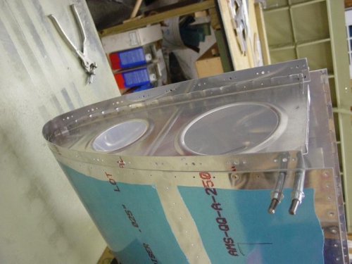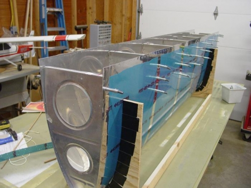 Put the leading edge skins into the cradle and started assembling with the ribs and splice strips. This was not easy to do even though the ribs were quite straight. Important trick learned: Leave the skin sitting up in the cradle so that it is opened up a bit, then cleco the bottom of the ribs to the skin. Then drop the skin down into the cradle and cleco the top, starting at the aft edge and working forward. Try to keep the rib lined up as best as possible. Some of the forward most holes didn't line up well due to the fluting, but they were pretty close. I just drilled those using the skin hole as the guide, it resulted in a slightly elongated hole in the rib.