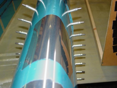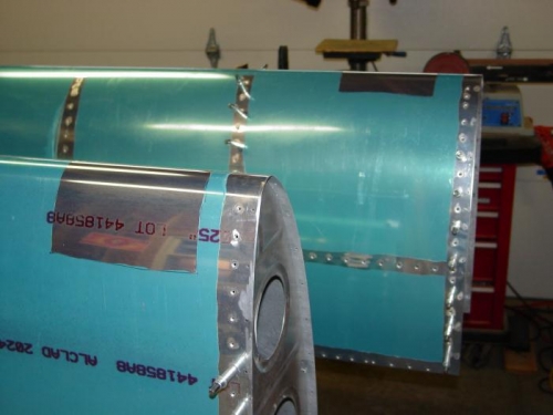Finished dimpling. Put a couple of ribs back in to hold the leading edge shape and got ready to cut out the leading edge holws for the Duckworks HID landing lights. It's a little creepy cutting a hole like that into the leading edge, I can see why you would want that as far outboard as possible.