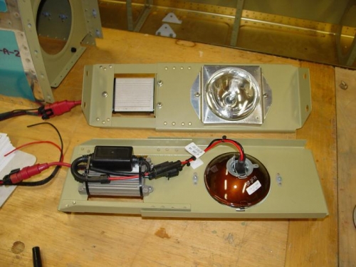 Riveting the right outboard leading edge. Final assembly on the landing light brackets with ballast mounted. Used loc tite blue on the mounting screws for the ballast. Dates 9/10 to 9/11/2012.