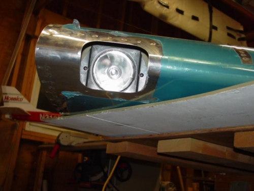 Finished riveting outboard leading edge (right side). Got the landing light brackets with lights mounted on both leading edges.