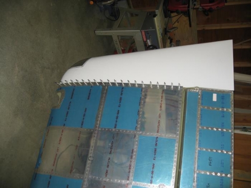Drilling of right tip to wing. The right wing tip was too long and will need trimming back, the left wing tip is too short and will need building up. Alignment was actually quite easy, but when the wing is hung it may not align as well. Some builders recommend not installing the tips until the wings are on the plane but I don't have the space to do that in my shop, so it gets done now per plans.