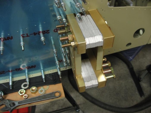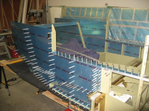 Started drilling the mid side skin on the right side. The temporary spar bolts need to be remove to allow drilling the rivet holes behind them. This was done for the top and bottom separately and the bolts were reinstalled so that the alignment was maintained.