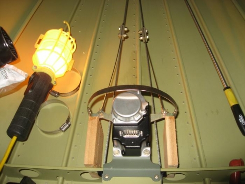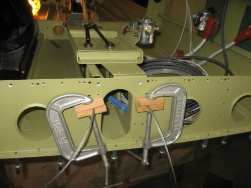 Installed the yaw damper bridle to connect to the rudder cables. I had to install the rudder and vertical stabilizer to get the proper alignment with some tension in the rudder cables. The wood block clamps worked great in keeping a little tension in the cables. I don't want there to be any slop in the bridle/rudder cable setup as it seems like that would prevent smooth operation of the yaw damper.