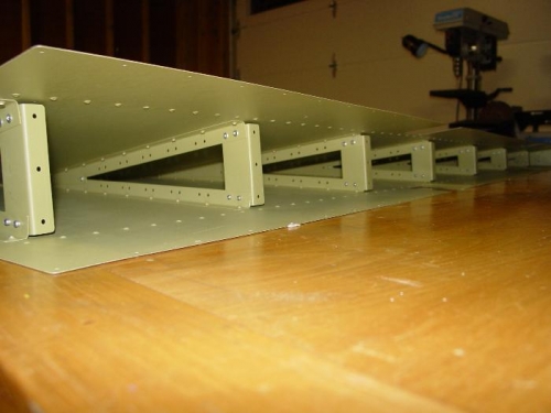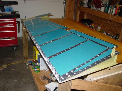 Finally got to experience the joy of working with Proseal. It actually isn't too bad if you're careful not to put too much on. Proseal is used to hold the trailing edge wedge in place and keep the trailing edge straight during final riveting. The stiffeners were riveted together joining the two skins and the bottom rib riveted to the skin. The trailing edge was all clecoed together to hold it tight while the proseal cures.