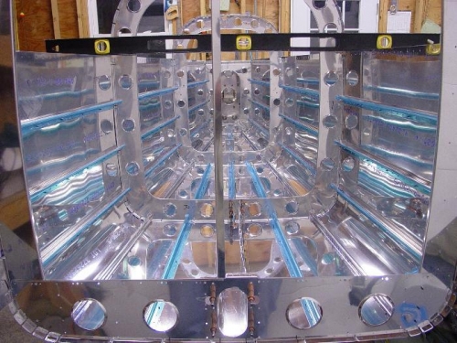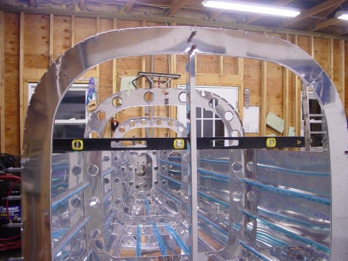 Finished match drilling the side skin to the stiffeners. Fabricated the rudder stop brace and stiffeners and clamped into place. Used the level as shown to verify that there is no twist to the tailcone while drilling the stiffeners to the brace. Match drilled the brace and bulkhead, and also the stiffeners to the brace. You NEED the 12" drill bit for this job, makes it a piece of cake.
