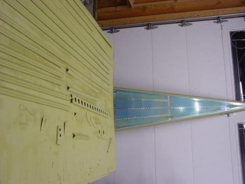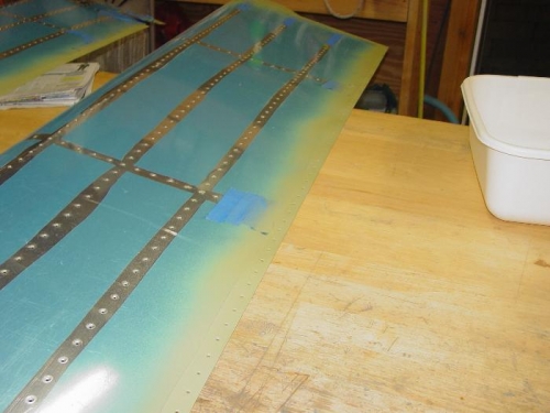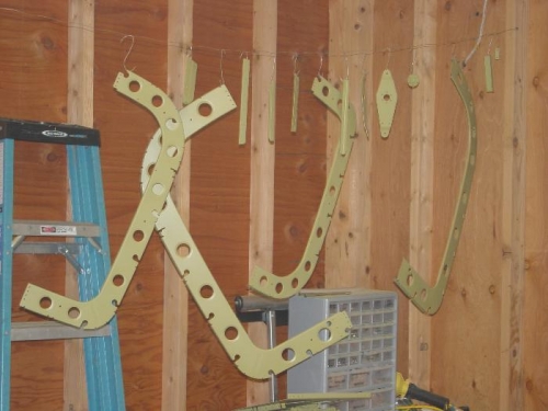 Finished priming the tailcone parts. I primed the skins where they overlap, so that there won't be any bare metal anywhere. I was mostly concerned about the edges of the forward bottom skin, the edge is rolled to form a stiffener and any moisture in the tailcone could sit down in this area.