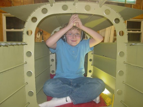 Started riveting the top skins. Shane fits perfectly in the tailcone and became an expert rivet bucker in no time. The tungsten bucking bar helps a lot, he produced excellent shop heads on the rivets he bucked.
