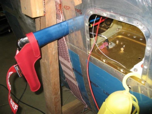 Installed pitot and wired heat controller. I had to cut the tubes a bit shorter to make hooking up the pitot/AOA lines easier. Pitot is RED, AOA is BLUE. When the wiring was finished I applied power at the wing root. The tip of the pitot got warm quickly, almost too hot to touch. Not sure if that is what is supposed to happen, but it was quite cool in the shop so maybe that triggers the heater to come on. I had purchased a nicer leather-like pitot cover to keep contaminants out. At this point I can close up the access plates on the bottoms of both wings, the last thing to install is the roll servo in the right wing, which I do not have. I have ordered the Bob Archer wingtip VOR/ILS/LOC antenna and RG400 to install in the right wingtip, once that is in I will put that tip on.
