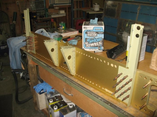 Began assembly of forward center section components. Riveted the seat rail support assemblies and bolted and riveted to spar web.