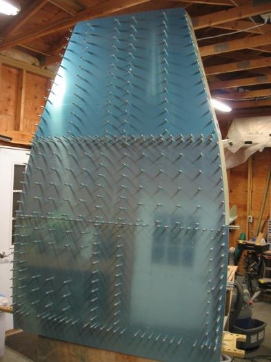 Finished riveting the baggage area ribs to the bulkhead. Clecoed the bottom skins to the mid fuse skeleton. Clecoed the floor stiffeners into the rear seat footwell area. Once again I don't have enough clecoes for the AD3 rivets.