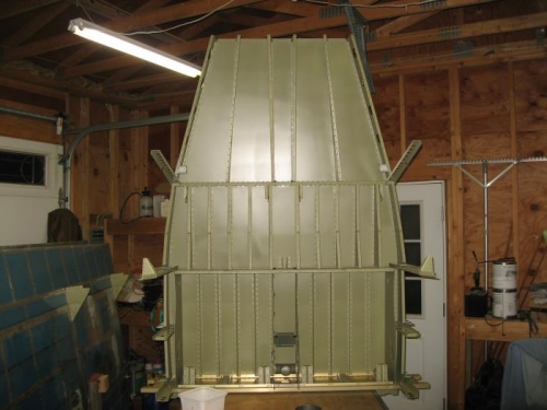 Started riveting the bottom skins. I started with the aft skin as I could set the spar on the floor on a piece of carpet and rivet while standing. After that the spar has to be on the edge of the bench to allow the forward skin to hang down. This is the overlap area that will eventually be covered by a forward bottom skin.