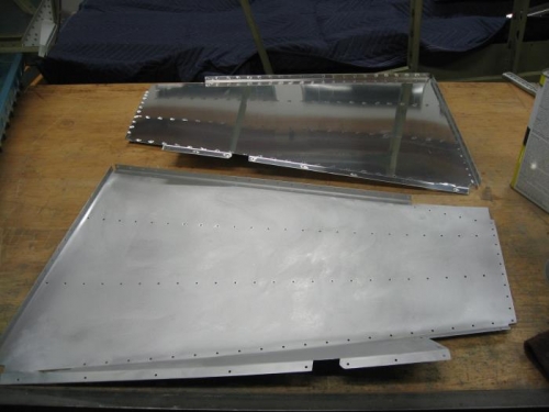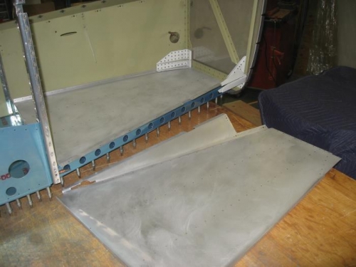 Drilling and surface prep of the front floor panels. I treated these the same as skins that are too large to alodine and I just used the scotchbrite pad on the electric orbital sander to scuff the surface before priming.