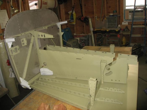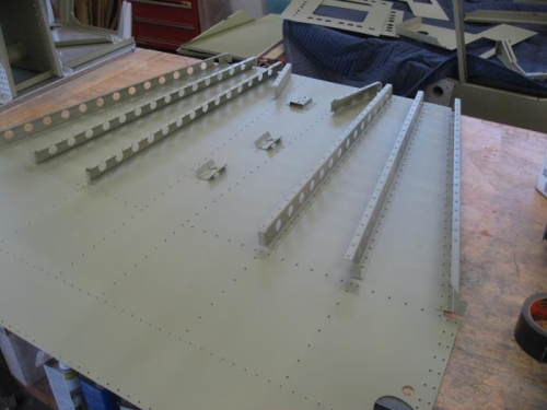 Riveting of floor ribs and bulkheads to skins and forward fuselage assembly.