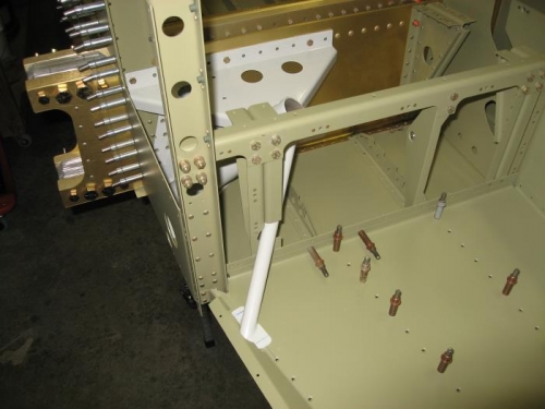 Temporarily install and set up the gear mounts for drilling to the front floors. It was quite challenging getting all the bolts in for the gear mount and there was some interefence with the edge of the holes on the bottom skins that needed some enlarging.