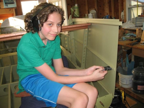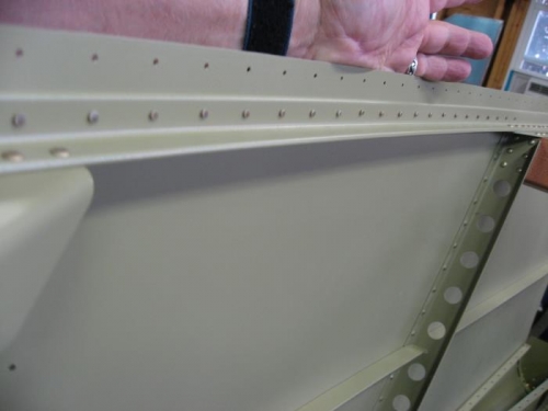 Riveting of right mid side skin. Needed some help bucking rivets so Lance got his first lessons in using the tungsten bucking bar.