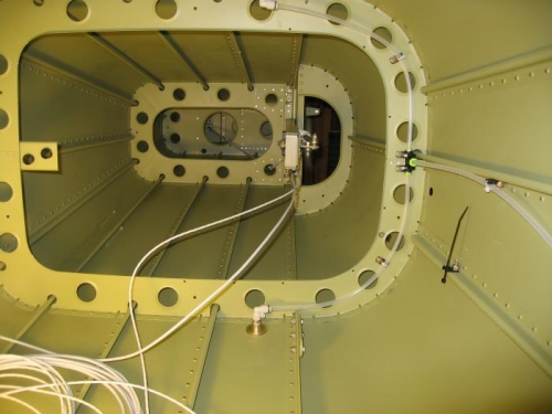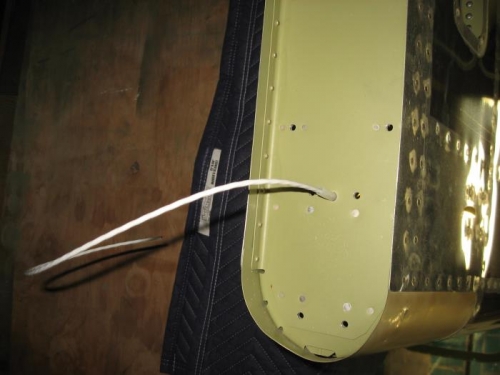Took a long time pondering how I should run the wire for the aft nav lights. I decided to use a piece of static tubing as conduit from aft of the elevator trim mount. I also decided to drill a hole through the aft tie-down mount near the top so that there's no chance of interfering with the tie down ring. That was a lot of material to drill through especially with the vertical stabilizer mounted. This comes out below the bottom rudder mount bracket but above the top edge of the rudder bottom fiberglass.