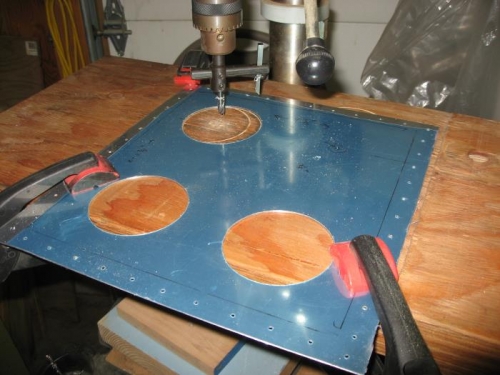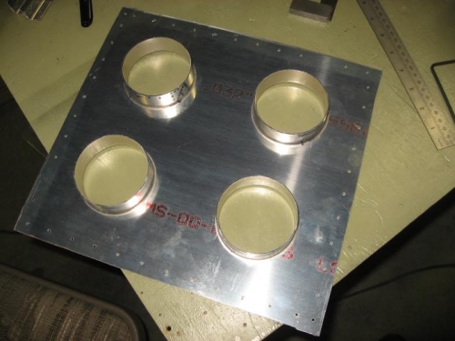 Drilled the attach angles to the face of the plenum. Cut the holes for the hose attach flanges. This was done with a fly cutter which is a bit dangerous, the part has to be secured very well and the cut made slowly to prevent grabbing. Worked out well in the end.