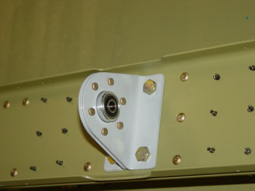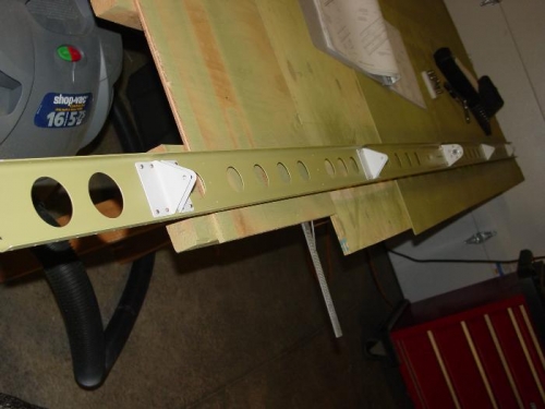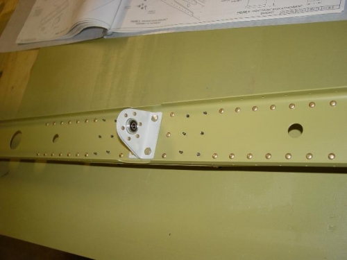 Riveted the stiffener to the rear spar. Riveted the hinge brackets to the spar, and assembled the inboard hinge bracket and bolted it to the spar.