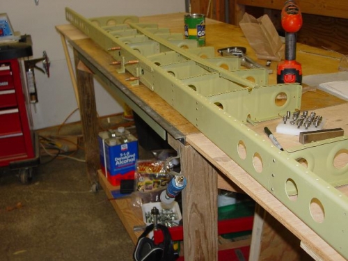 Got the inspar ribs riveted to the front spar. Put the skins back in the cradles and got the nose ribs clecoed in place. These would be difficult to rivet without the tungsten bucking bar, it looks like.
