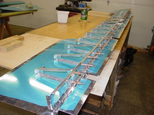 Got the forward spar and ribs clecoed to the bottom skins.