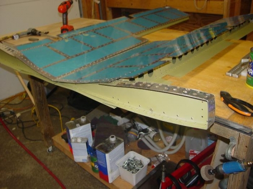 Riveted the skins to the rib flanges on the inboard end. Clecoed the tip ribs on and riveted to the shear clips. Rivet the tip assembly to the front spar.