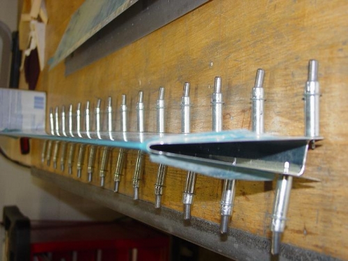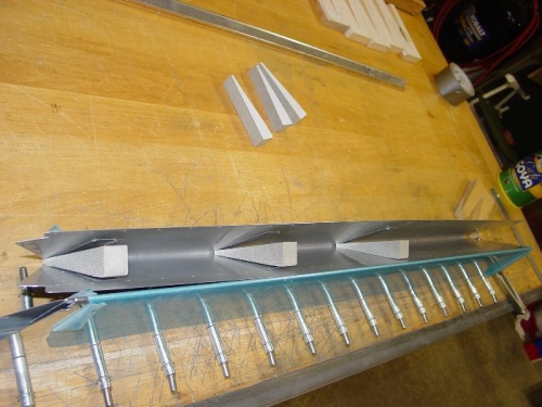 Made the 6 trim tab ribs from the foam blocks. Masked the rib locations for priming. Finished putting the bend in the tabs.