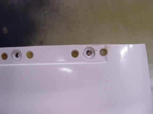 Rudder bottom fairing. Same technique as the rudder tip fairing. This came out better overall than the tip fairing. On the forward screw hole I should have used the nutplates with both rivets on one side, since the rivet hole overlapped the edge of the recess. When mounted it doesn't really show though.