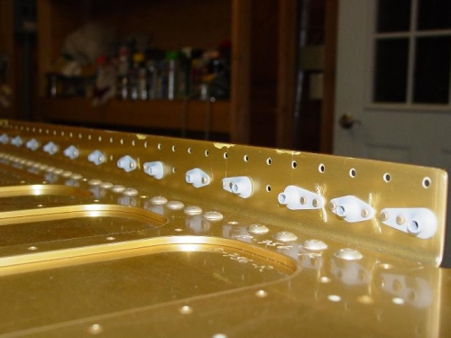 Riveted on the fuel tank skin attach nutplates. These are gray because I clean them in some MEK and then shoot some rustoleum on them for a little protection. Not sure if it will make any difference but they look nicer.