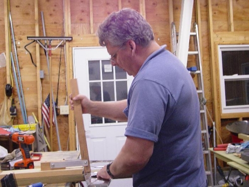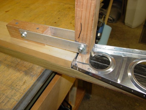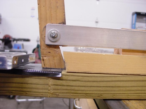Wing rib preparation. This entry cover all the deburring, fluting, and squaring of the ribs from 10/24 to 12/13/09. A friend of mine knows an RV builder who told me of this tool he built for squaring the rib flanges with the webs. The angle was cut at 11 degrees to allow for the springback of the flange. It works great, but it does crush the flutes down a little, putting a bend back in the rib so I will need to touch up the flutes again. I did one set of ribs like this, before I do the next set I will modify the angle on the bottom of the 'handle' so that it will leave a gap and not crush the fluting back down. Only the 'toe' of the tool should touch the rib, down in the radius between the flange and web of the rib.